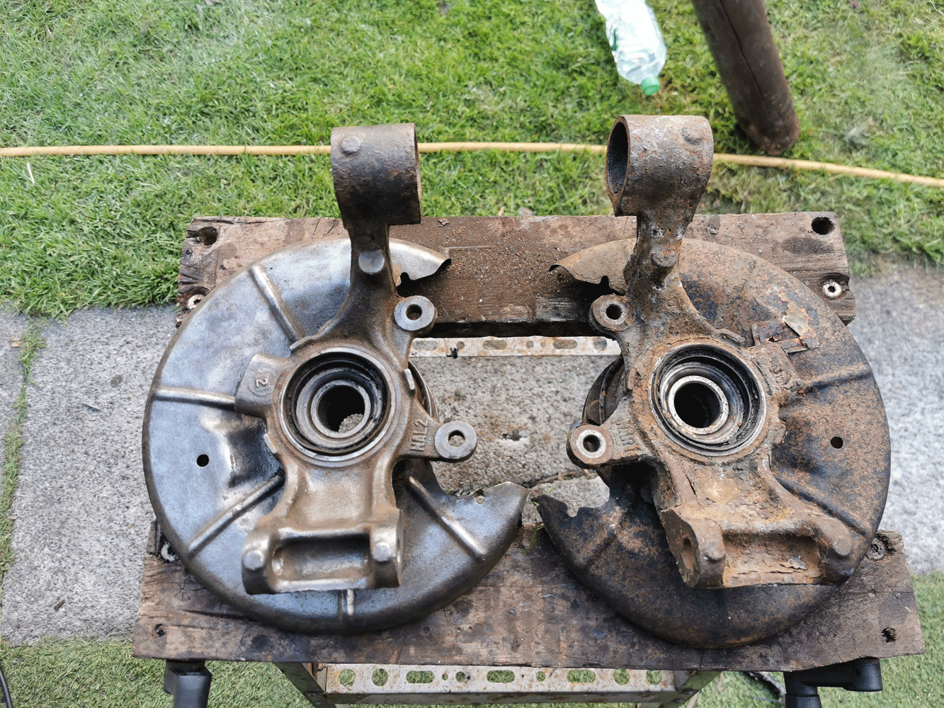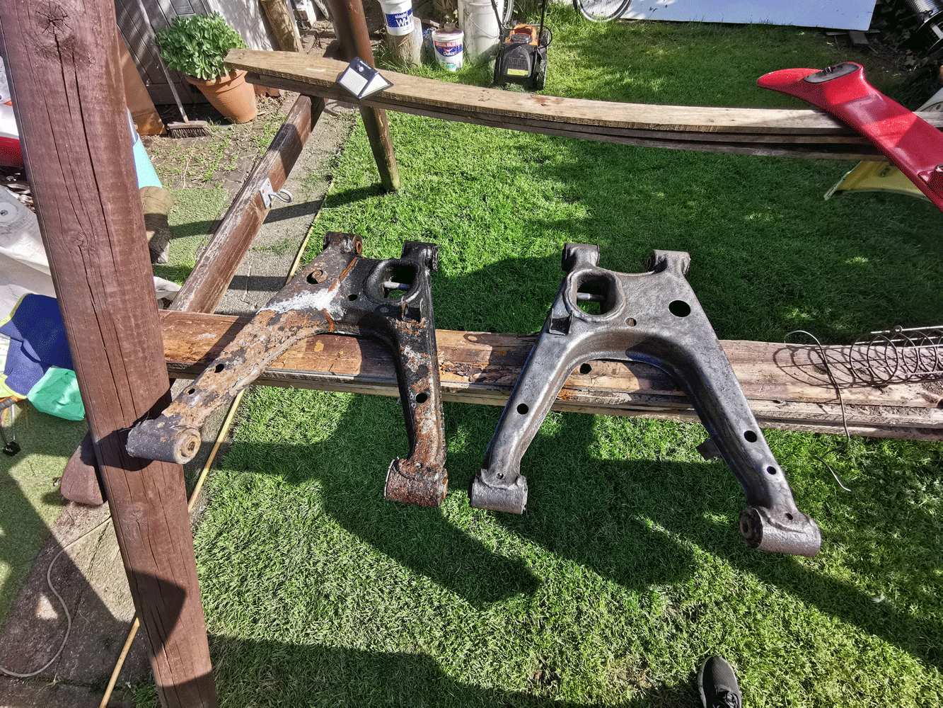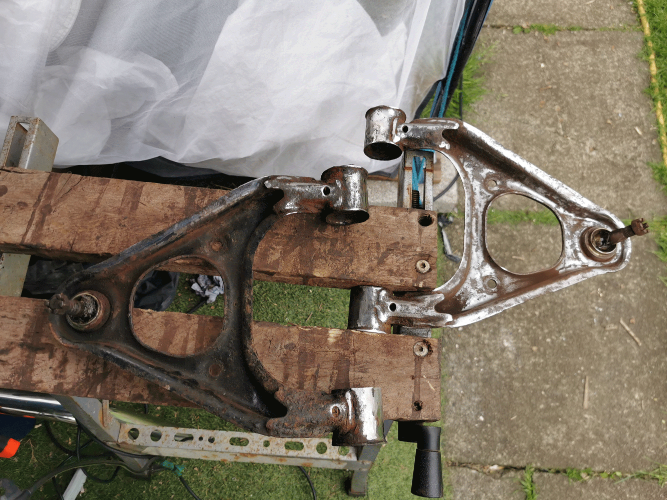 The car was completely stripped, interior and exterior. I removed what crud I could from components with a wire wheel on a drill. The wishbones, arms and subframes then went through a process called electrolysis, where I placed the component into a big bucket of electrolyte (water and washing powder!). In this bucket I also placed a sacrificial bit of metal. The sacrificial piece of metal acted as the anode, connected to the positive lead of an old PSU I modified to give a constant 12v feed. The negative end connected to the car part I wished to de-rust. After roughly 24 hours I would remove the part and wire brush it again. You can see the results of this in some of the images below with a side-by-side comparison. What did I learn from this project? Project times can over-run and become very expensive!